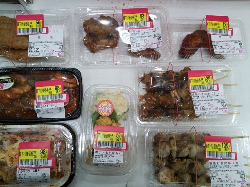 閉店前の惣菜コーナーに行くと、半額以下になっています。